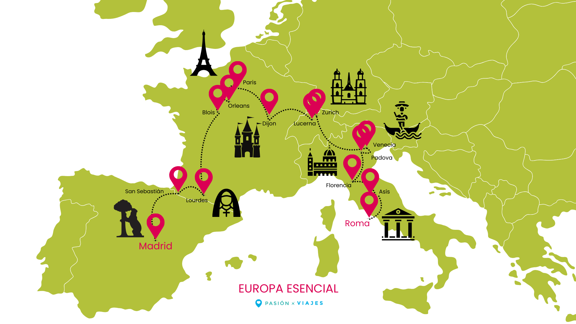 Madrid, San Sebastián, Lourdes, Blois, Orléans, París, Dijon, Zürich, Lucerna, Venecia, Padova, Florencia, Asís y Roma.